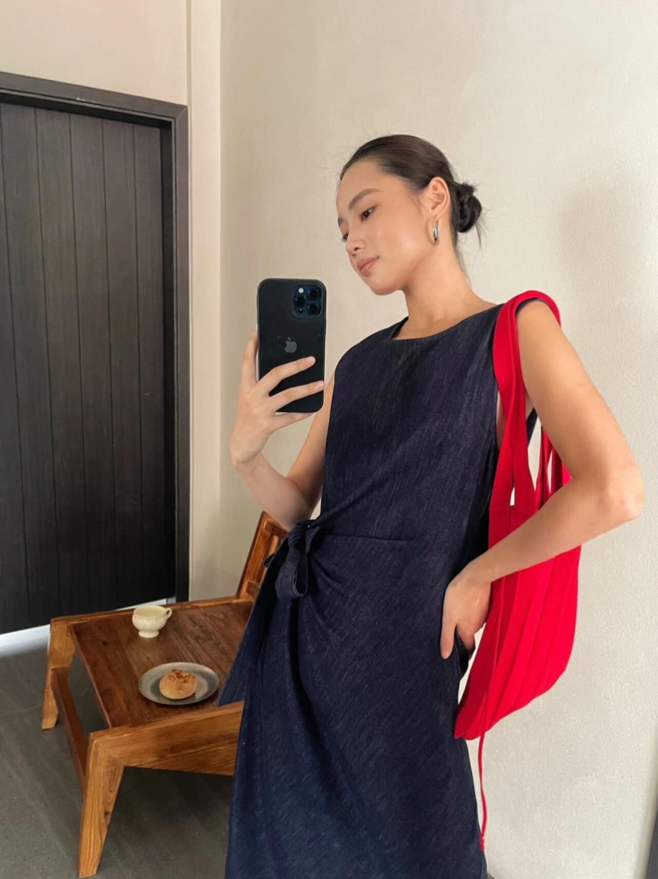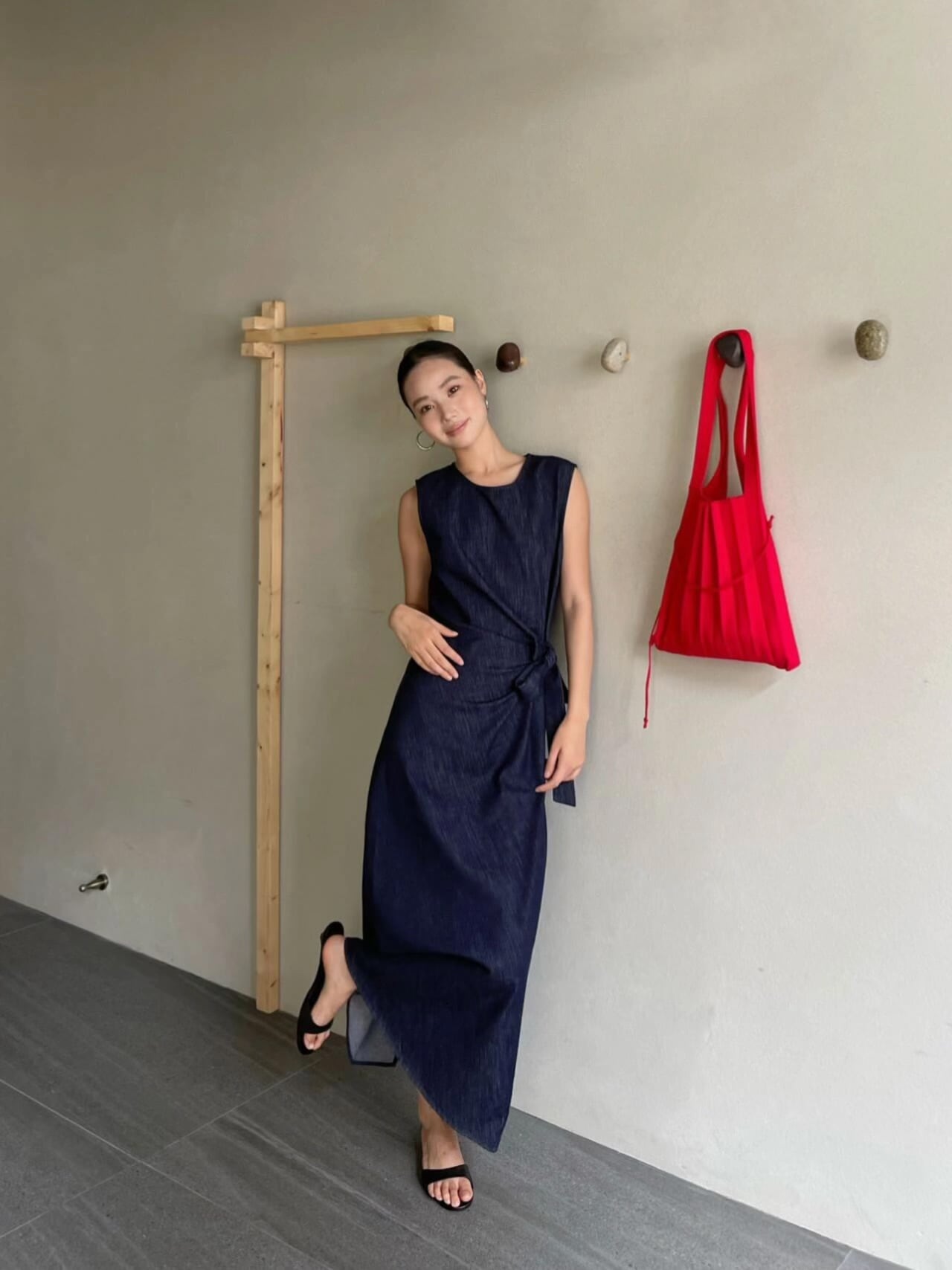 **PURITY JANPAN・ミニマルフレンチ風 ライセルデニム綿 軽やかデコンストラクト 結び紐付きノースリーブワンピース**