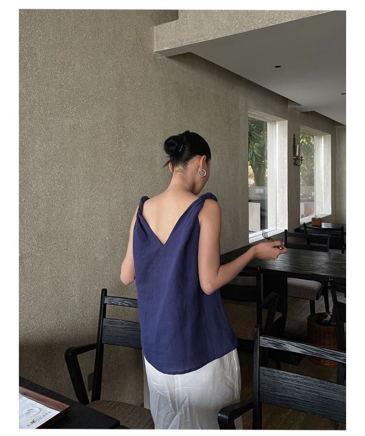 **フレンチ風Vネックキャミソール 深ネイビー レディース トップス ノースリーブ ツイストデザイン 着痩せ**