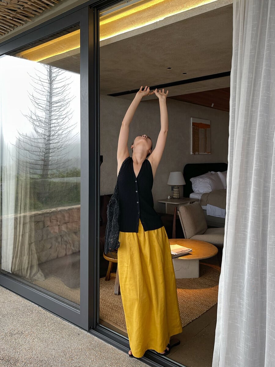 PURITY JAPAN · ミニマルでお洒落なオレンジリネンミディ丈スカート ウエストゴム仕様で着回し自在の大人カジュアルな一枚