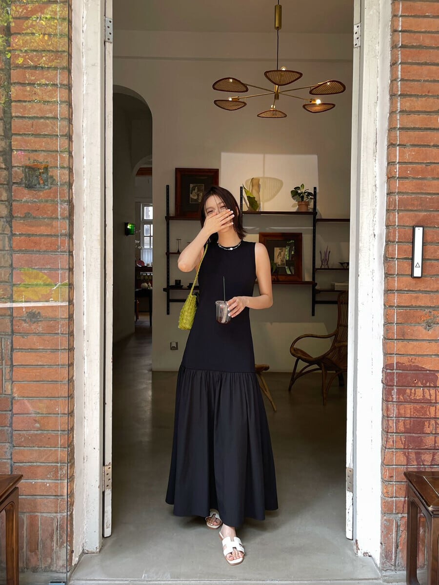 **PURITY JAPAN|モード感あふれるフレンチスタイルのハイウエストロングワンピース(ブラック)**