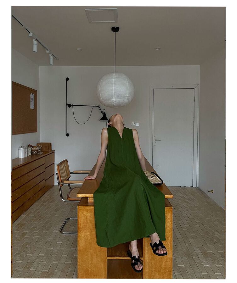 PURITY JAPAN・ミニマルリゾート風ホルターネック2025グリーン夏スリム見えリネンロングワンピースAラインノースリーブドレス