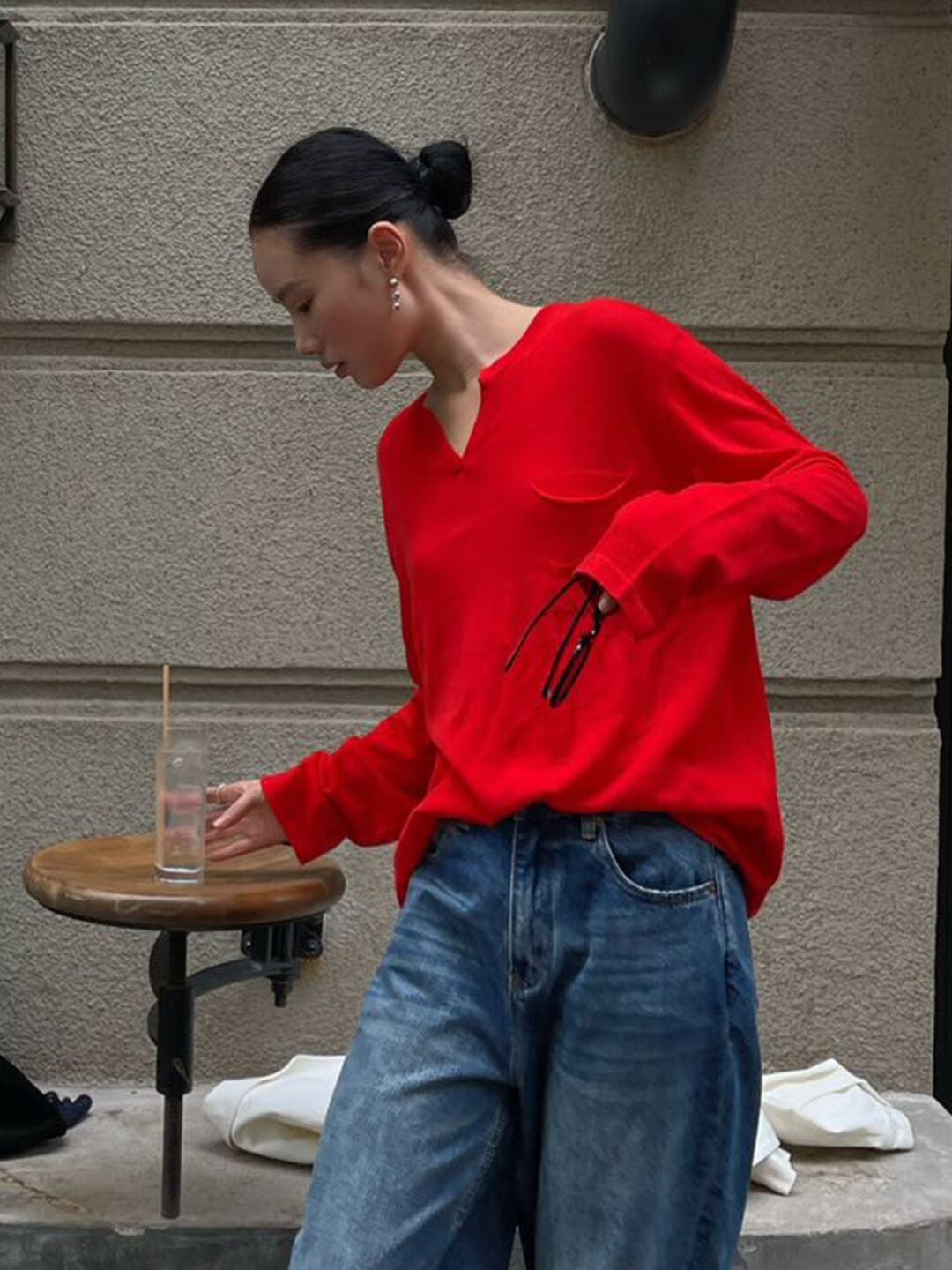 ・カラー: 鮮やかな赤色はコーディネートのアクセントになり、どんなボトムスとも相性抜群。日常のスタイリングに新鮮さを加えます。