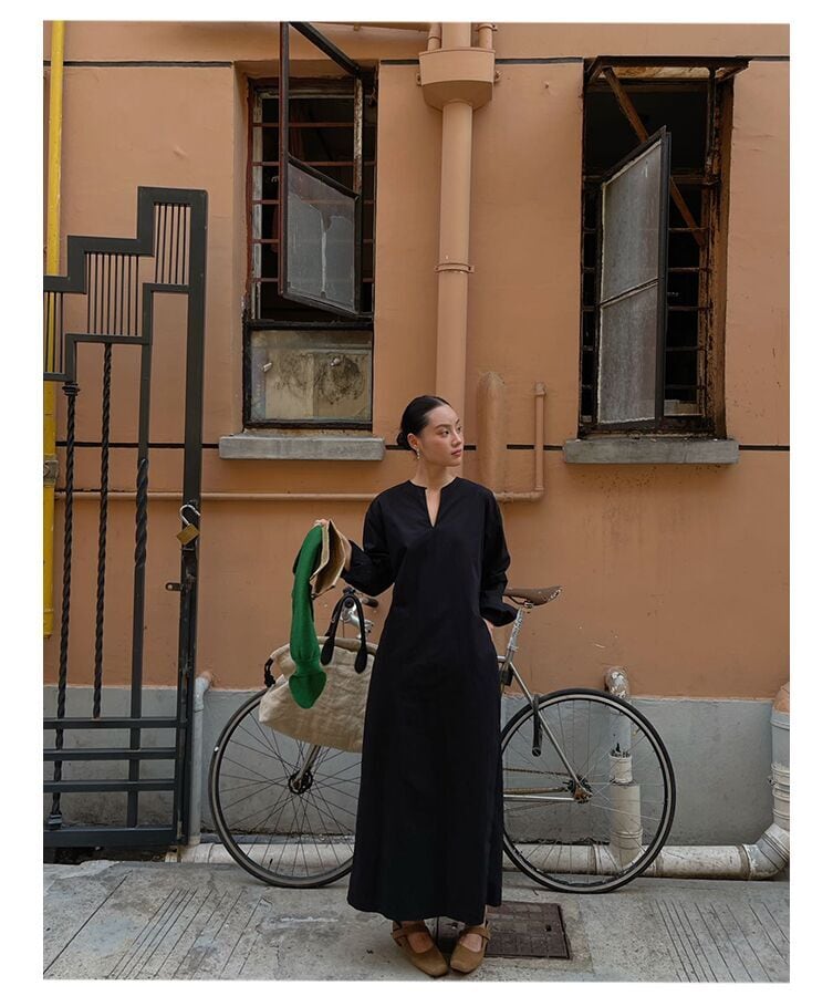 PURITY JAPAN・フレンチシンプルVネックワンピース レディース 新作 長袖 ゆったり体型カバー 大人上品カジュアル