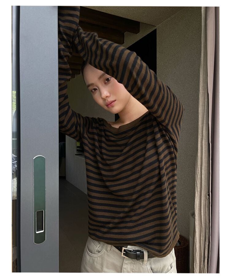 **PURITY JAPAN · 秋新作 ニッチミニマル 韓国風 ボーダー ニットトップス レディース 長袖Tシャツ ゆったり インナーにもアウターにも使える シンプル おしゃれ 体型カバー 細見え 大人カジュアル**