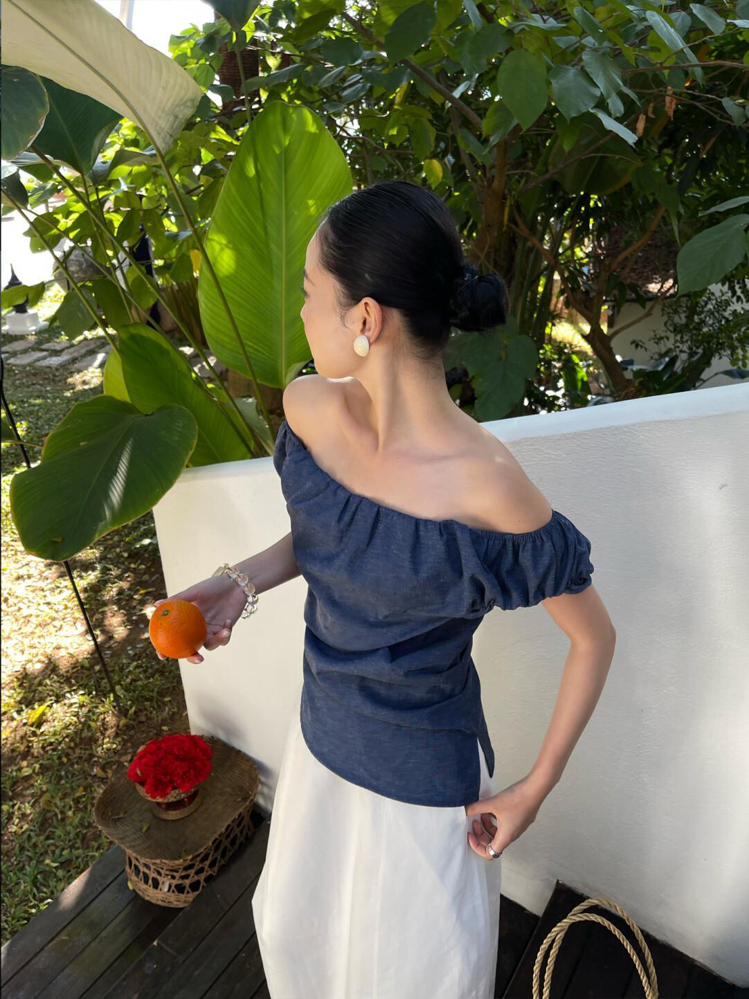 ・素材:デニム調生地・伸縮性:なし・シルエット:フィット・デザイン:オフショルダー・季節:春 / 夏