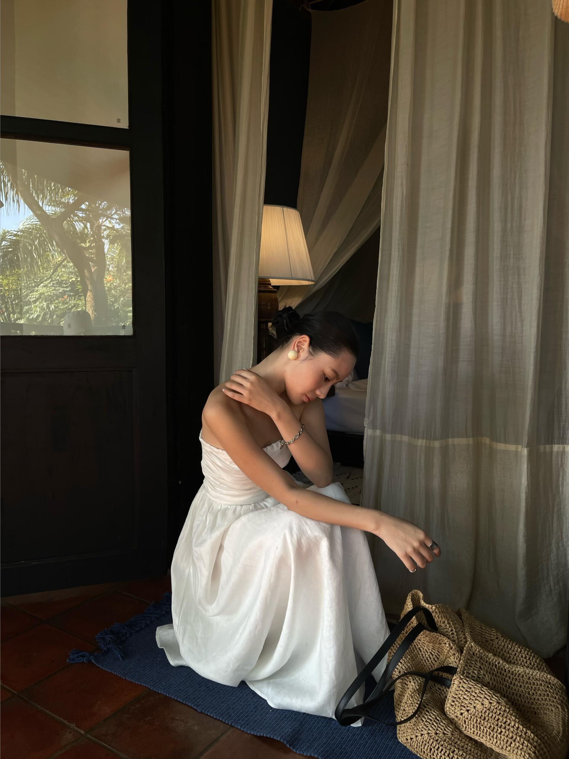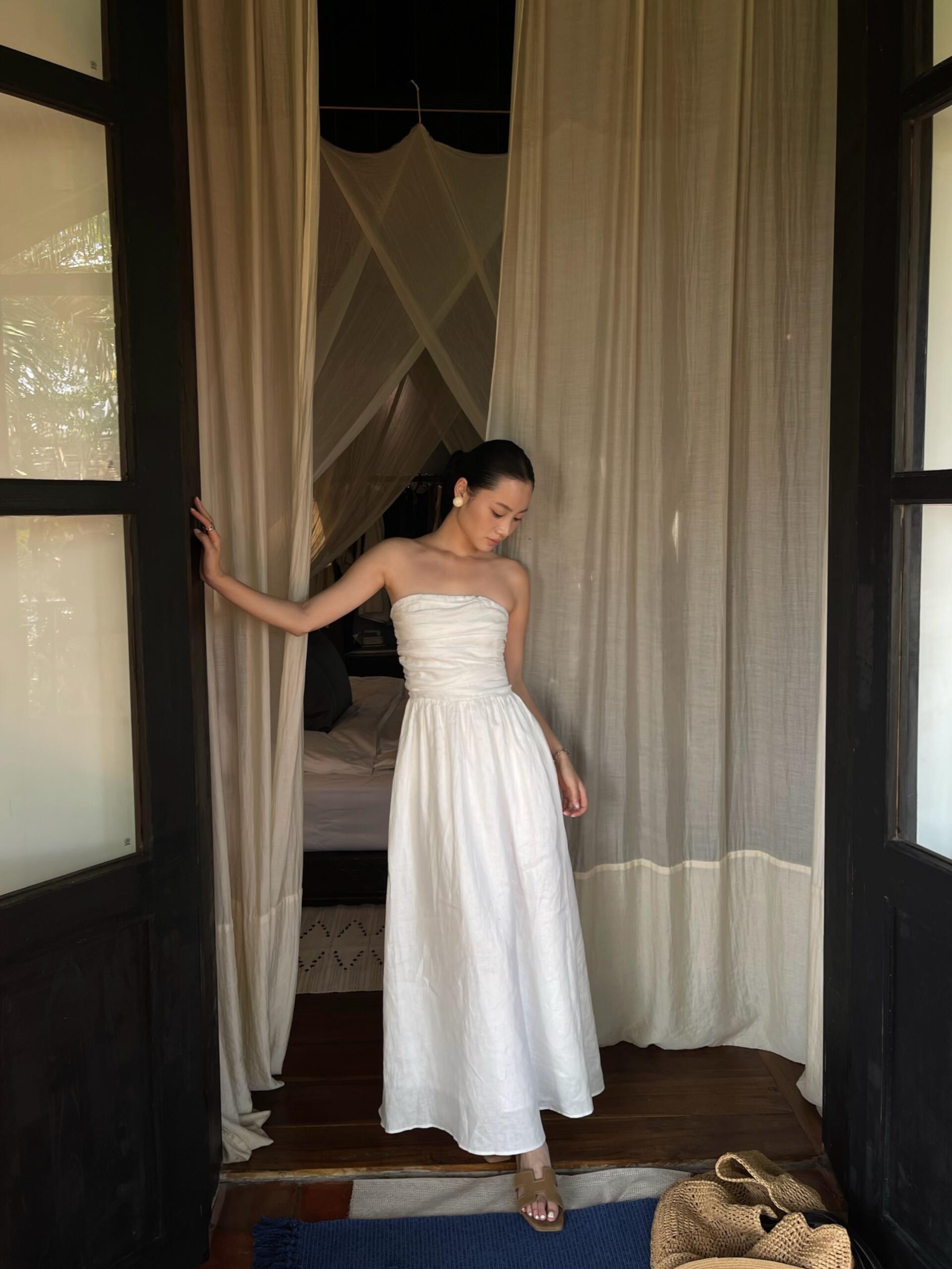 7230 PURITY JAPAN フレンチミニマル 白リネン風ベアワンピース レディース 夏 ロング丈 ハイウエスト切替 細見え 体型カバー ギャザー デザイン 無地 上品 リゾート ナチュラル 大人カジュアル 涼しい 高見え ノースリーブ ワンピース