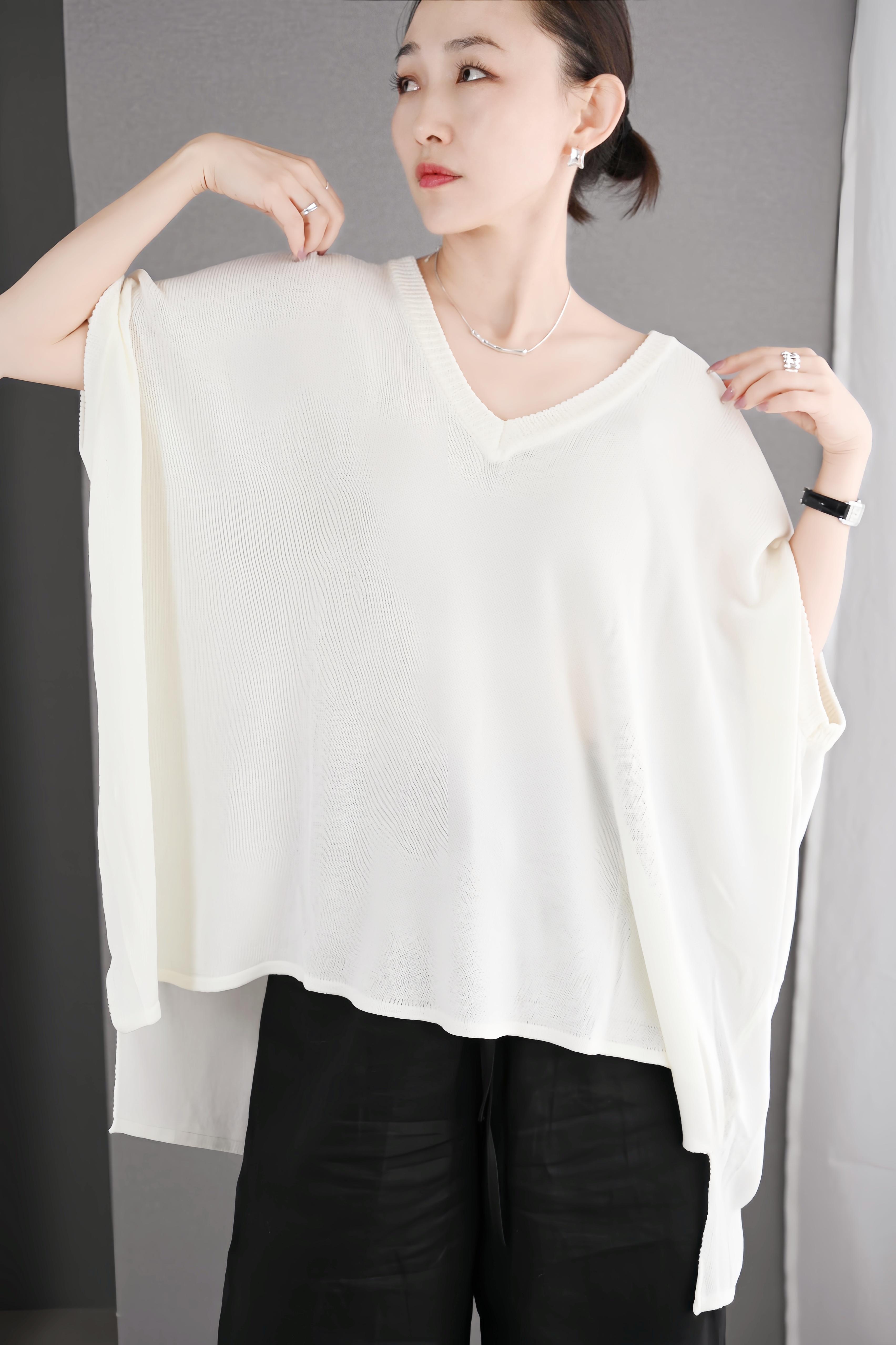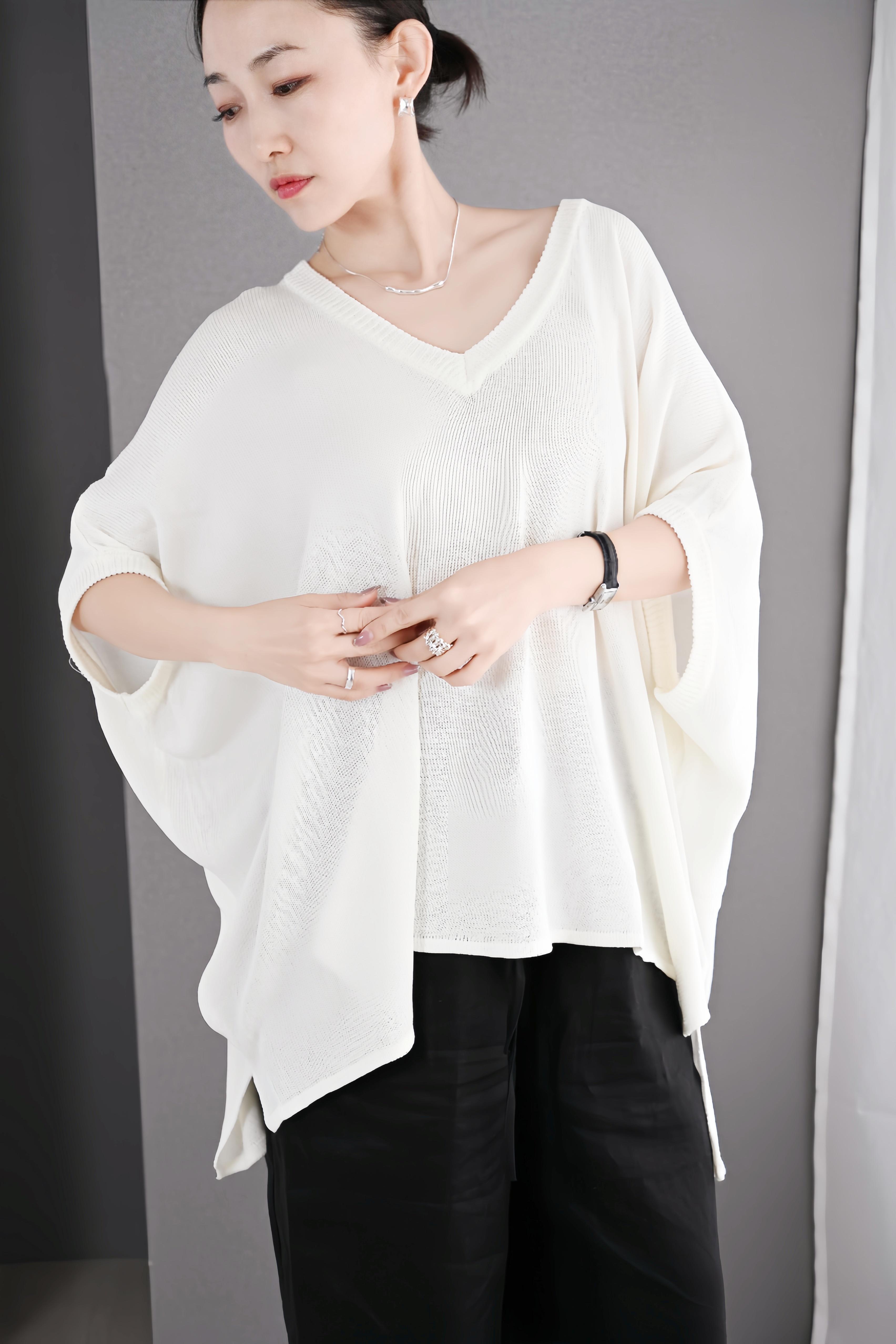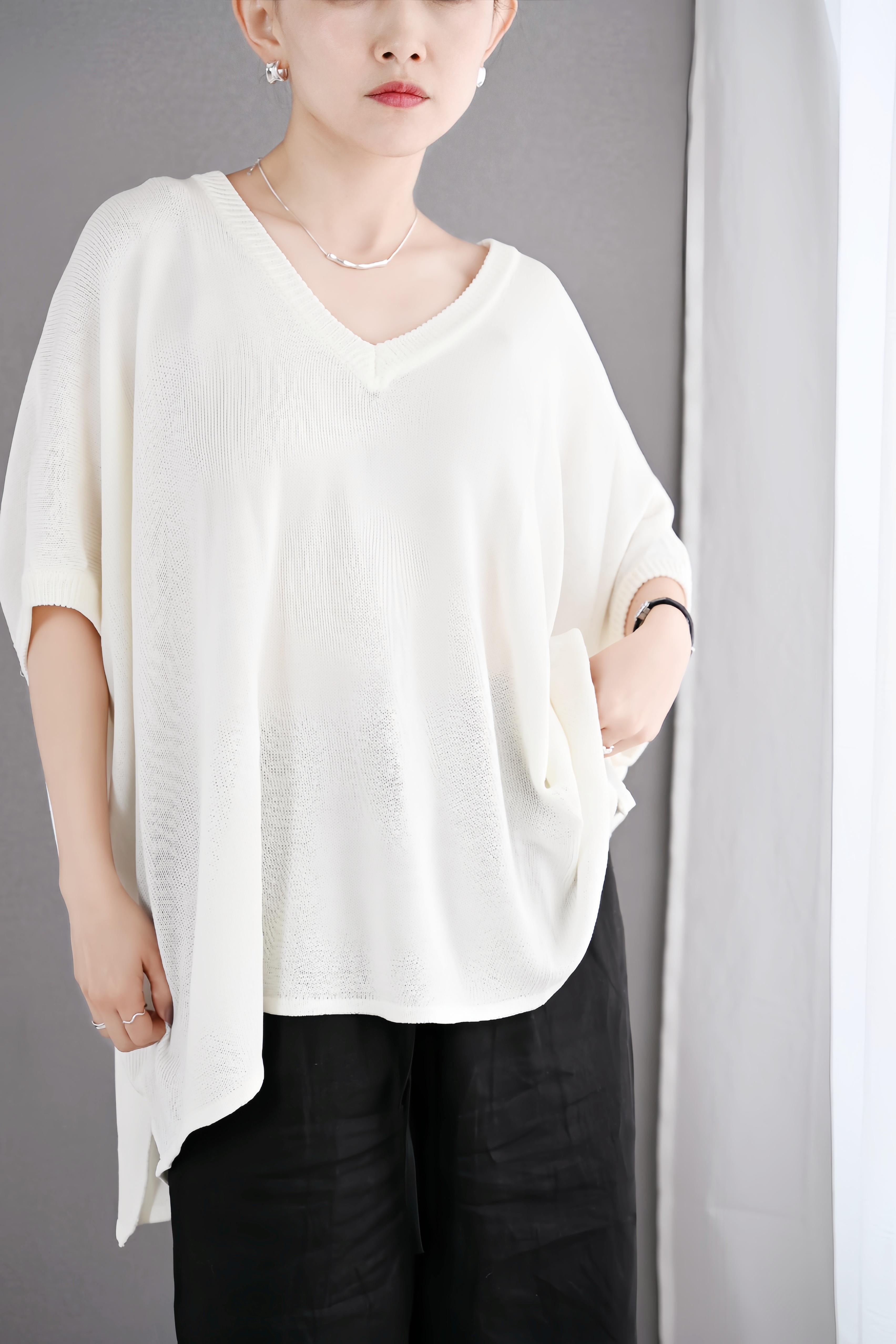 ゆったりとしたシルエットとVネックデザインで、気になる肩まわりや二の腕を自然にカバーしながら、抜け感のある大人の女性らしさを演出します。