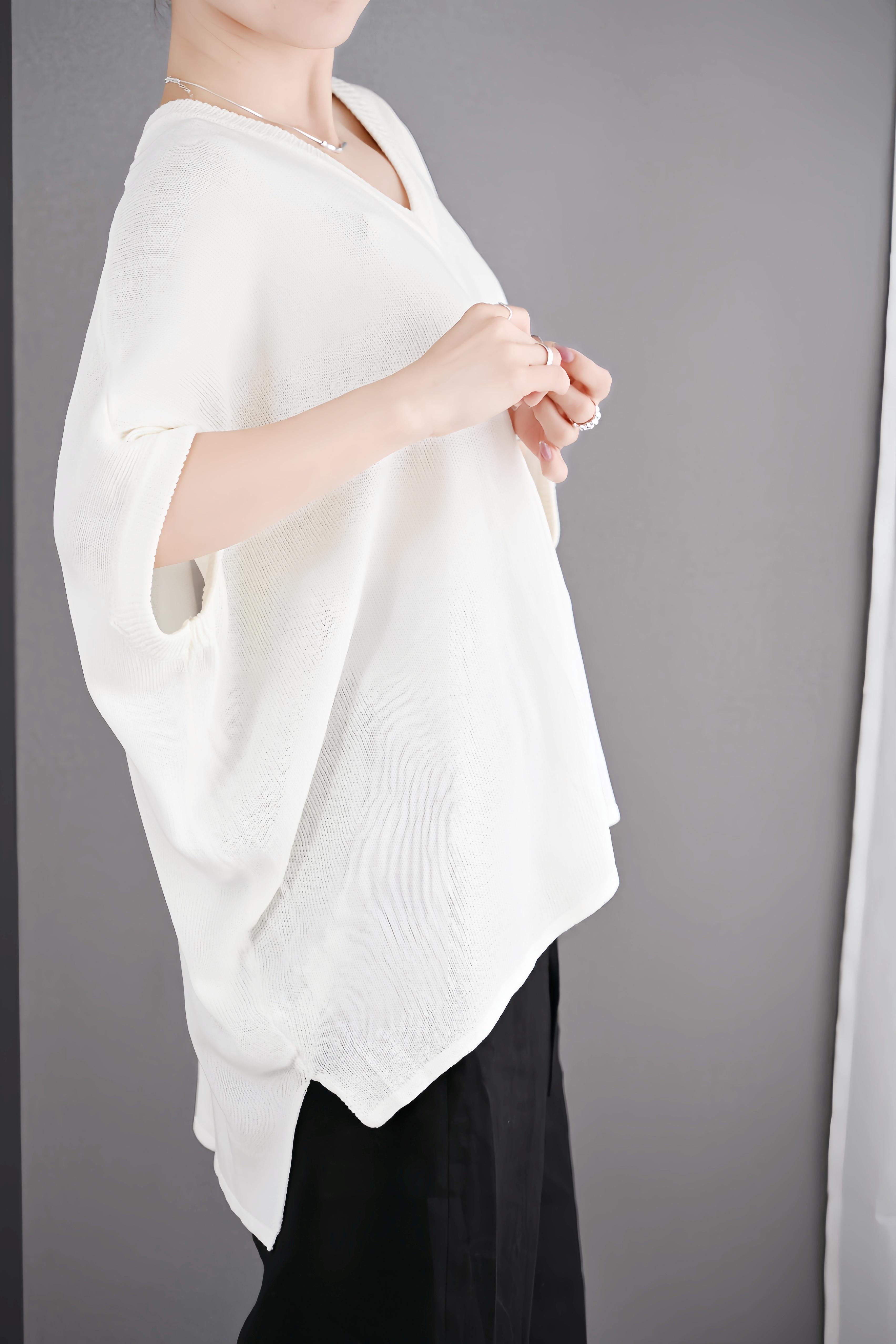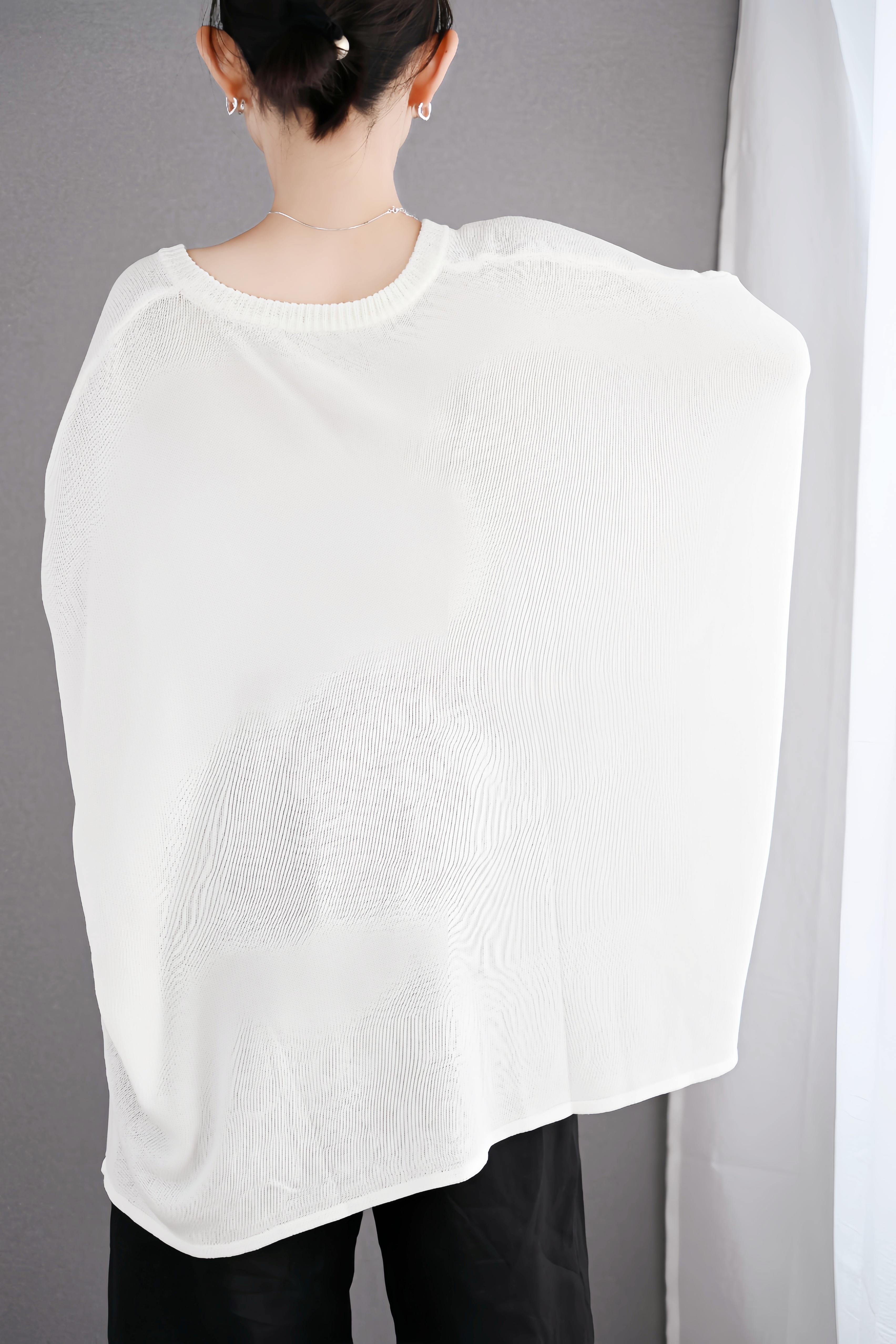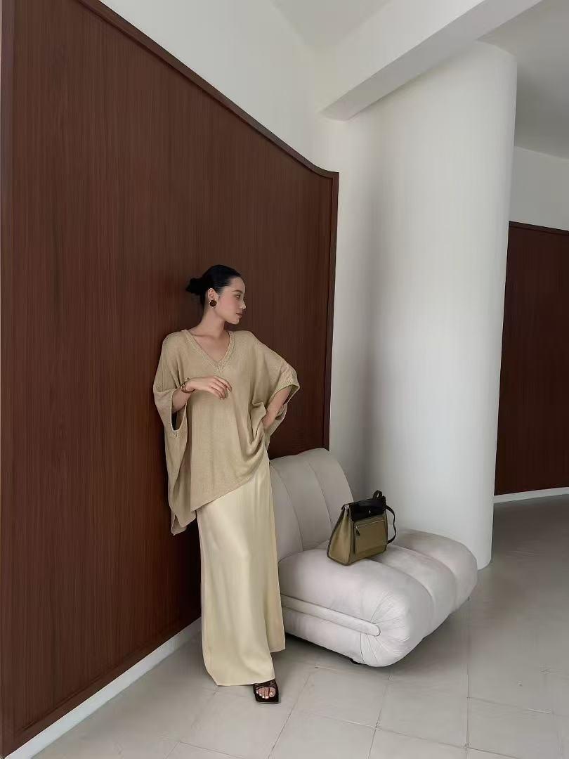 ゆったりとしたシルエットとVネックデザインで、気になる肩まわりや二の腕を自然にカバーしながら、抜け感のある大人の女性らしさを演出します。