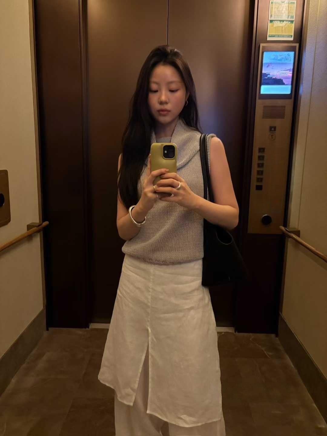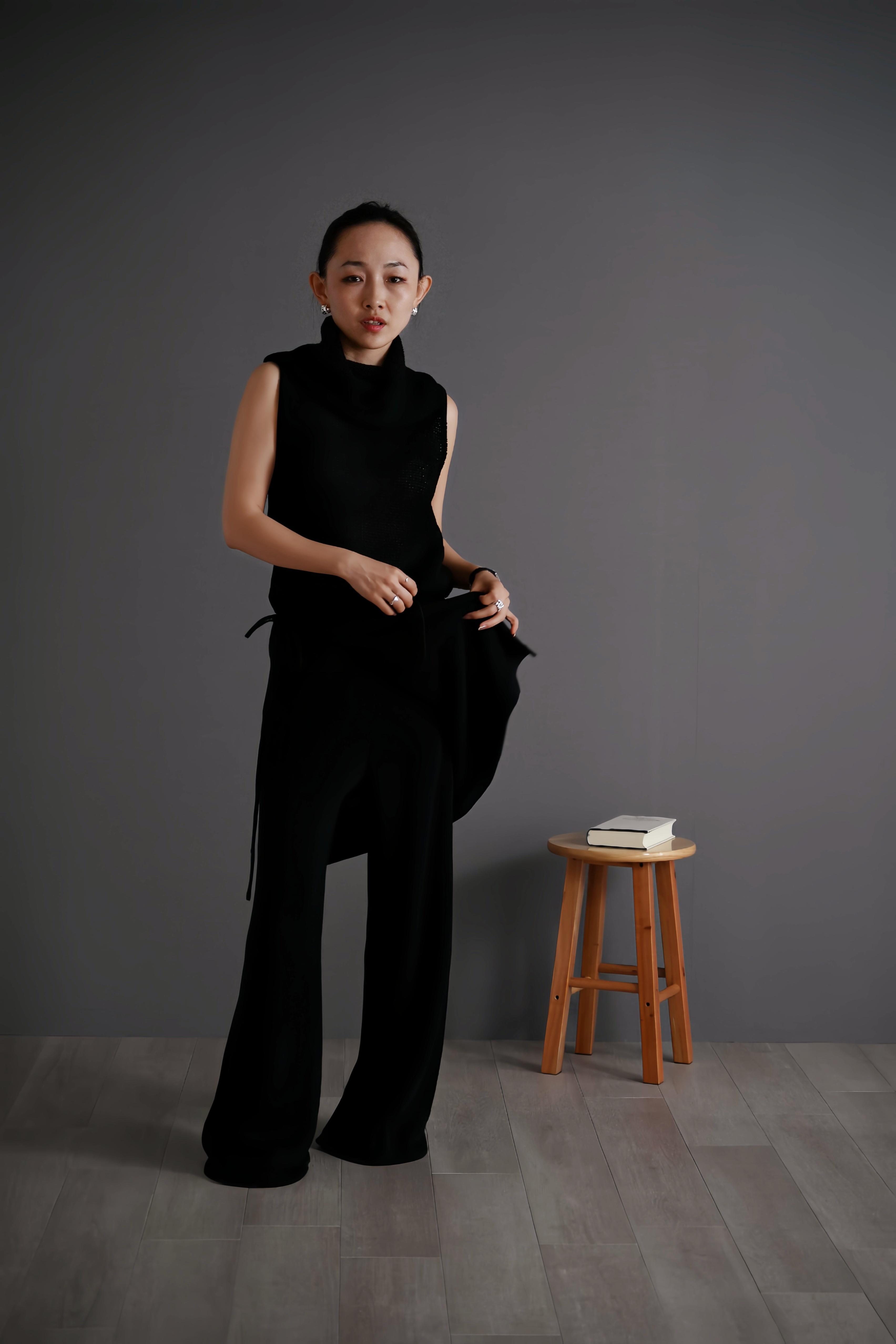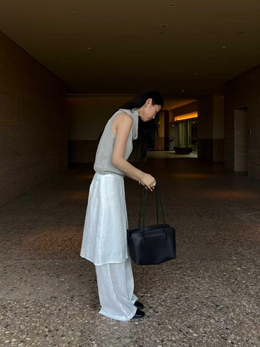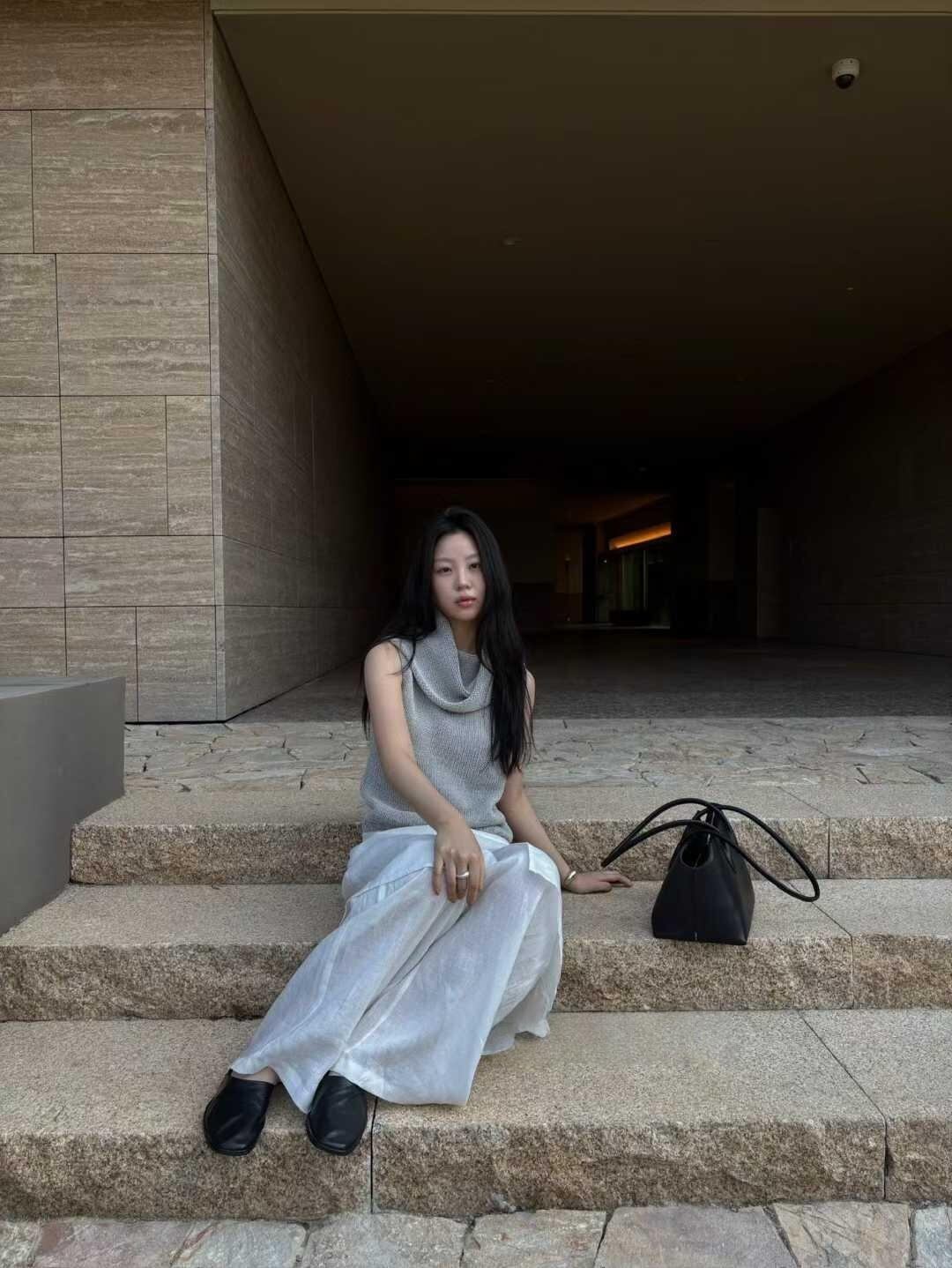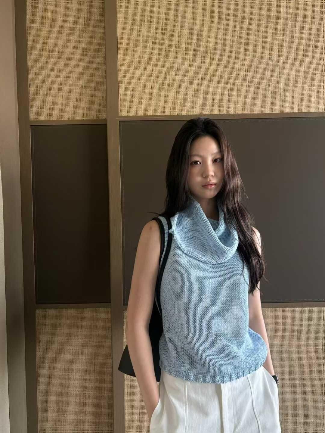 程よい伸縮性があり、体に自然になじみつつ、ラインを拾いすぎない絶妙なシルエット。首元はゆるやかに落ちるドレープデザインで、シンプルなのにこなれた印象に。