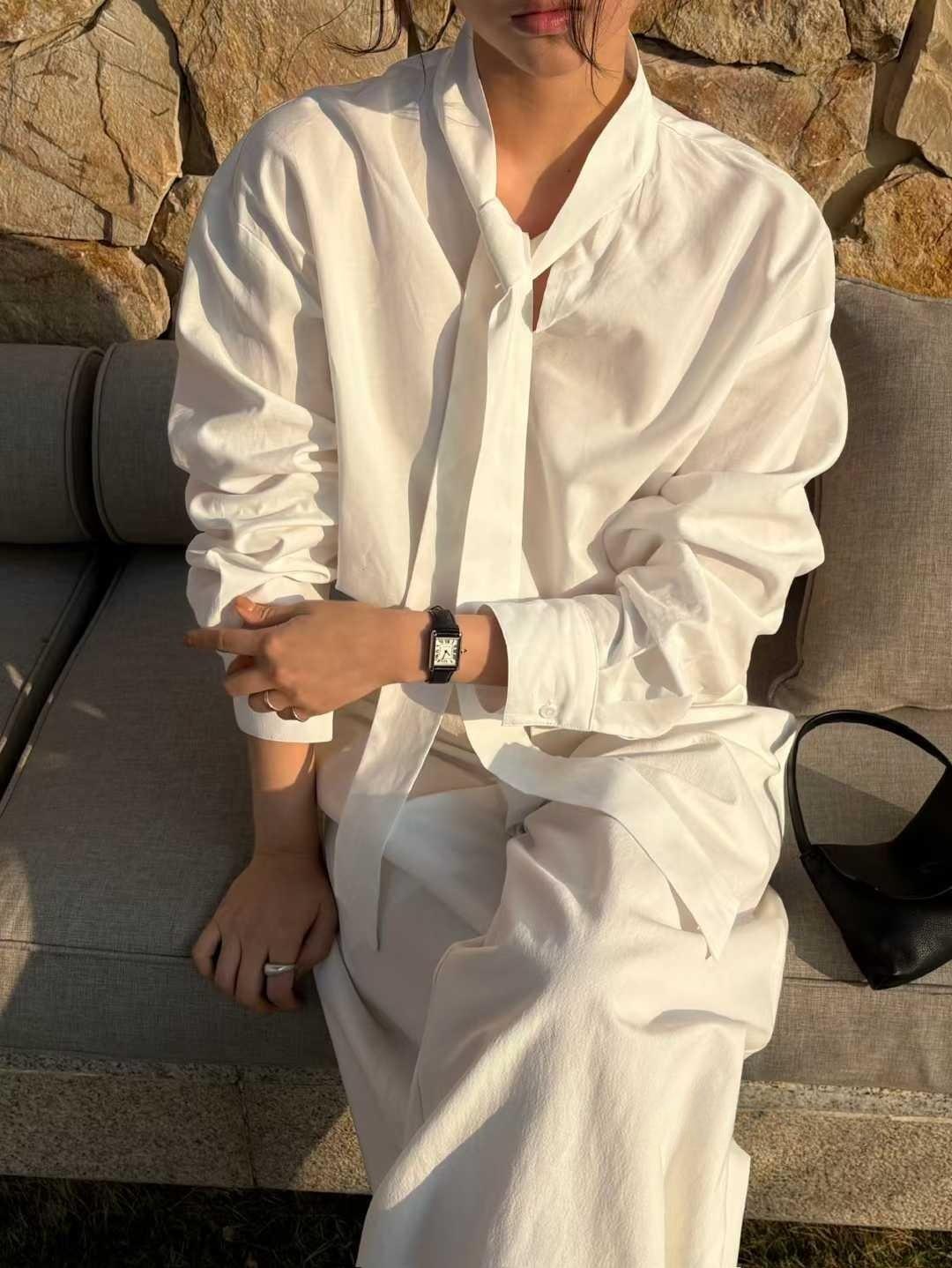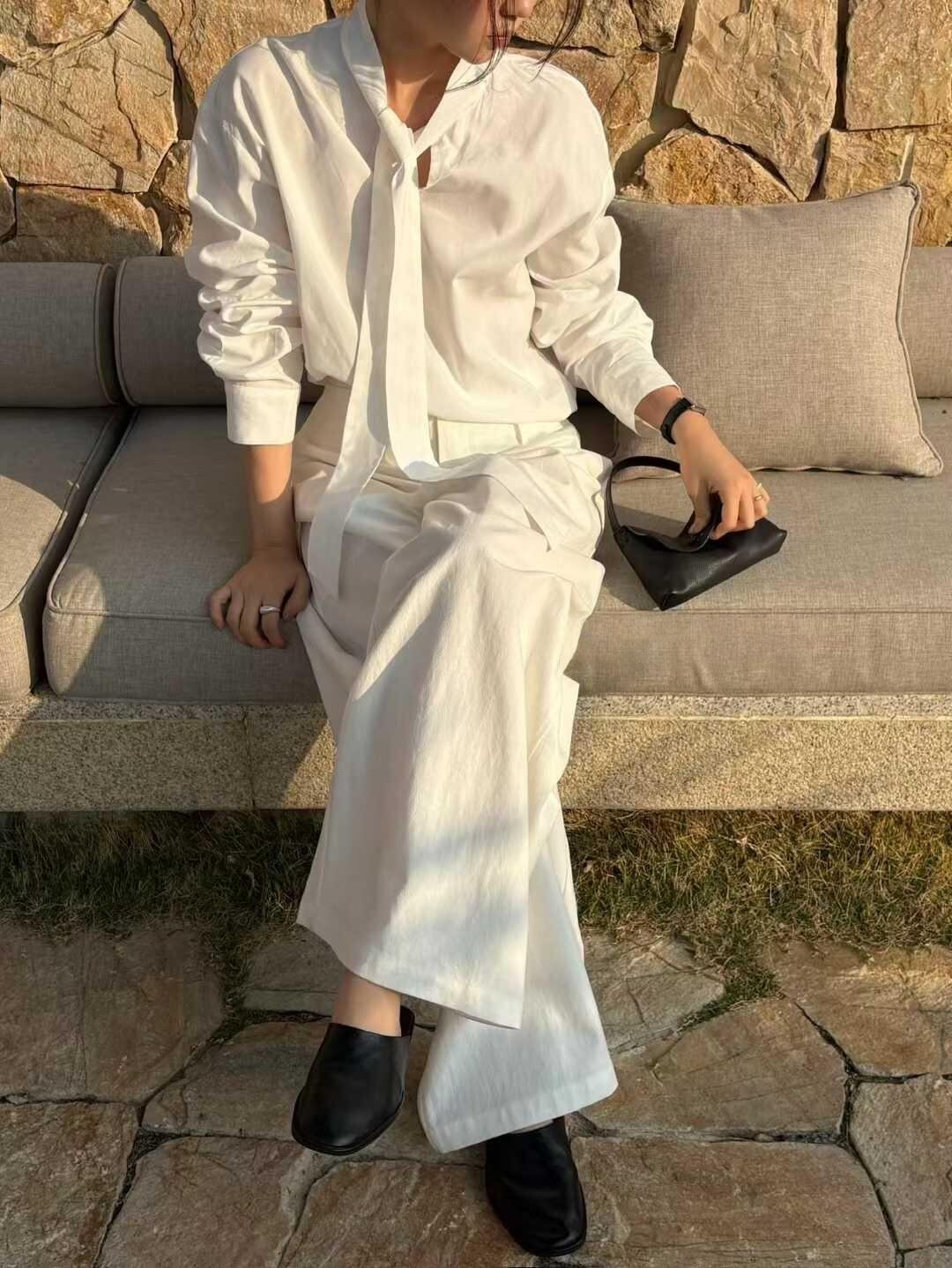 G8020 PURITY JAPAN ボウタイブラウス レディース フレンチミニマル 上品 とろみ素材 綿麻混 長袖シャツ 無地 きれいめ 通勤 大人コーデ 高見え 抜け感 リラックスシルエット 春秋 シンプル 洗練