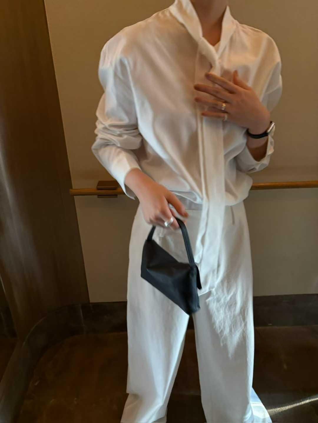 首元のボウタイデザインは、結び方次第で印象を変えられるのがポイント。その日の気分で“きれいめにも、抜け感にも”。