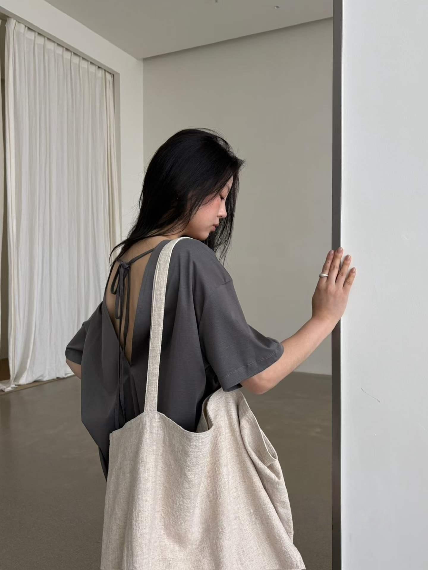 程よいゆとりのトップスは、背中がさりげなく開いたバックデザイン仕様。抜け感を演出しながらも、ヘルシーで大人っぽい印象に。