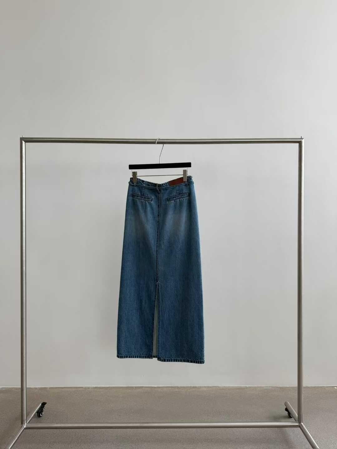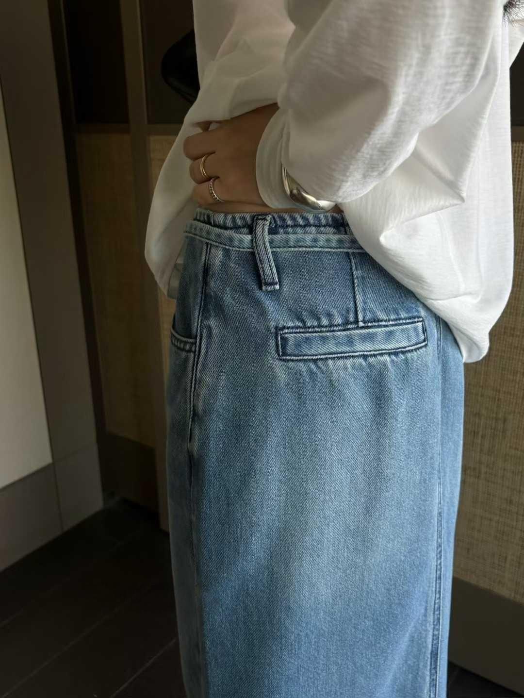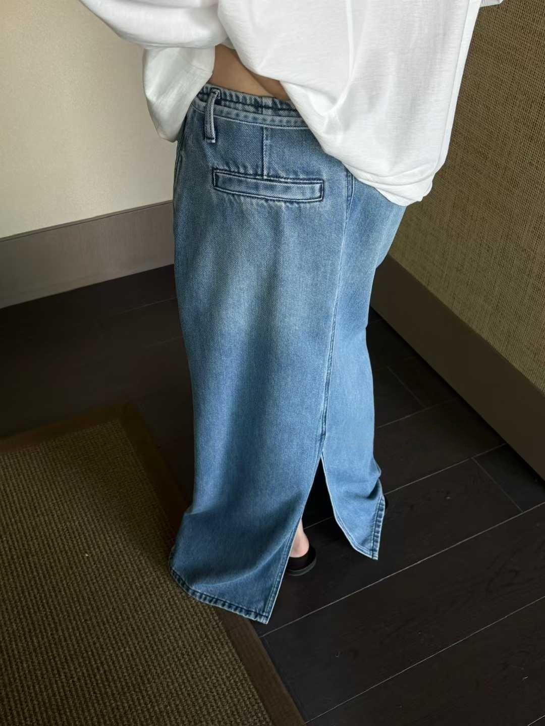 フロントの縦ライン切替が視覚的に脚を長く見せ、後ろにはスリット入りで、ロング丈でも歩きやすさを確保。カジュアルなデニムながら、どこか上品さを感じる一枚です。