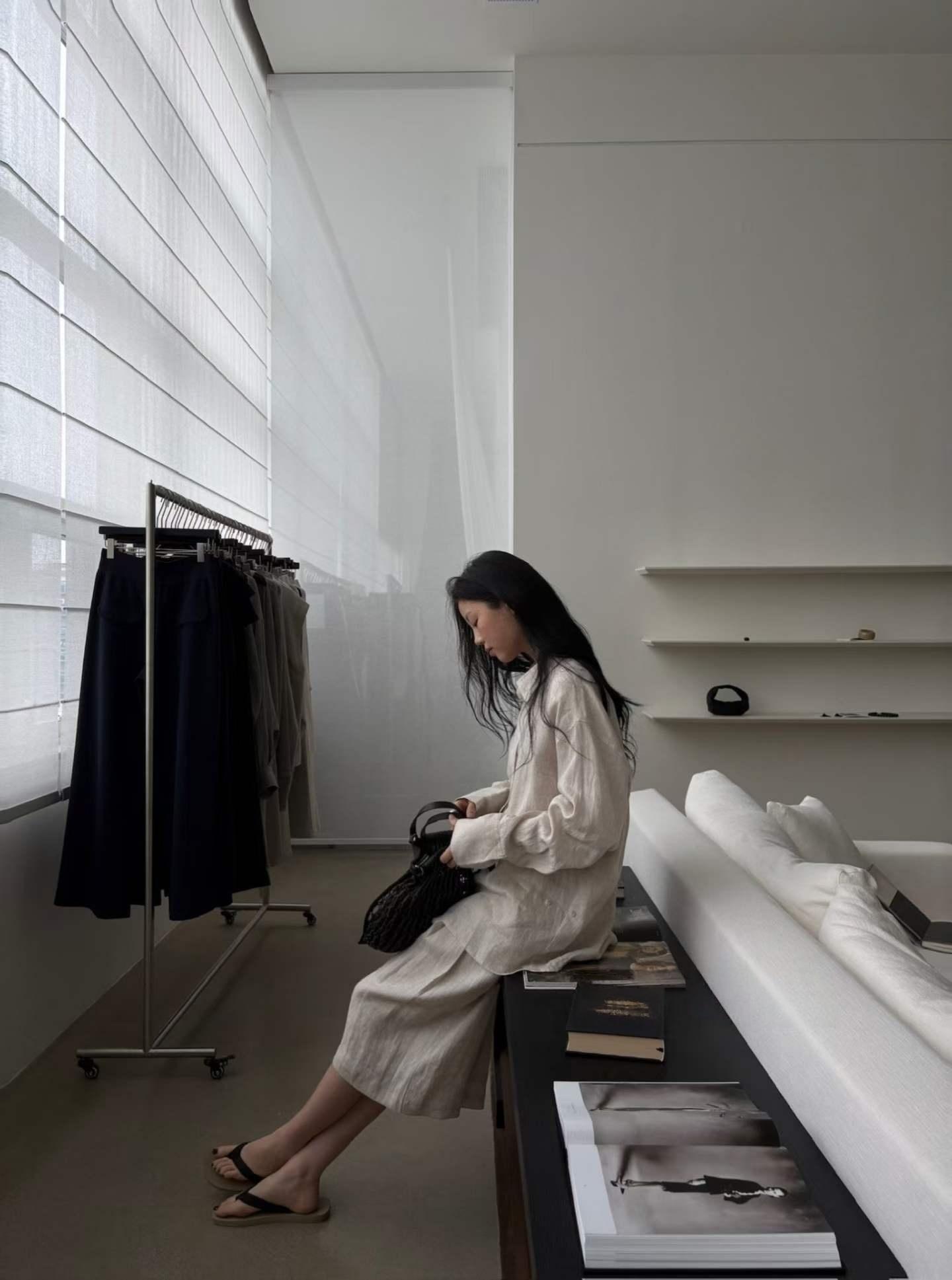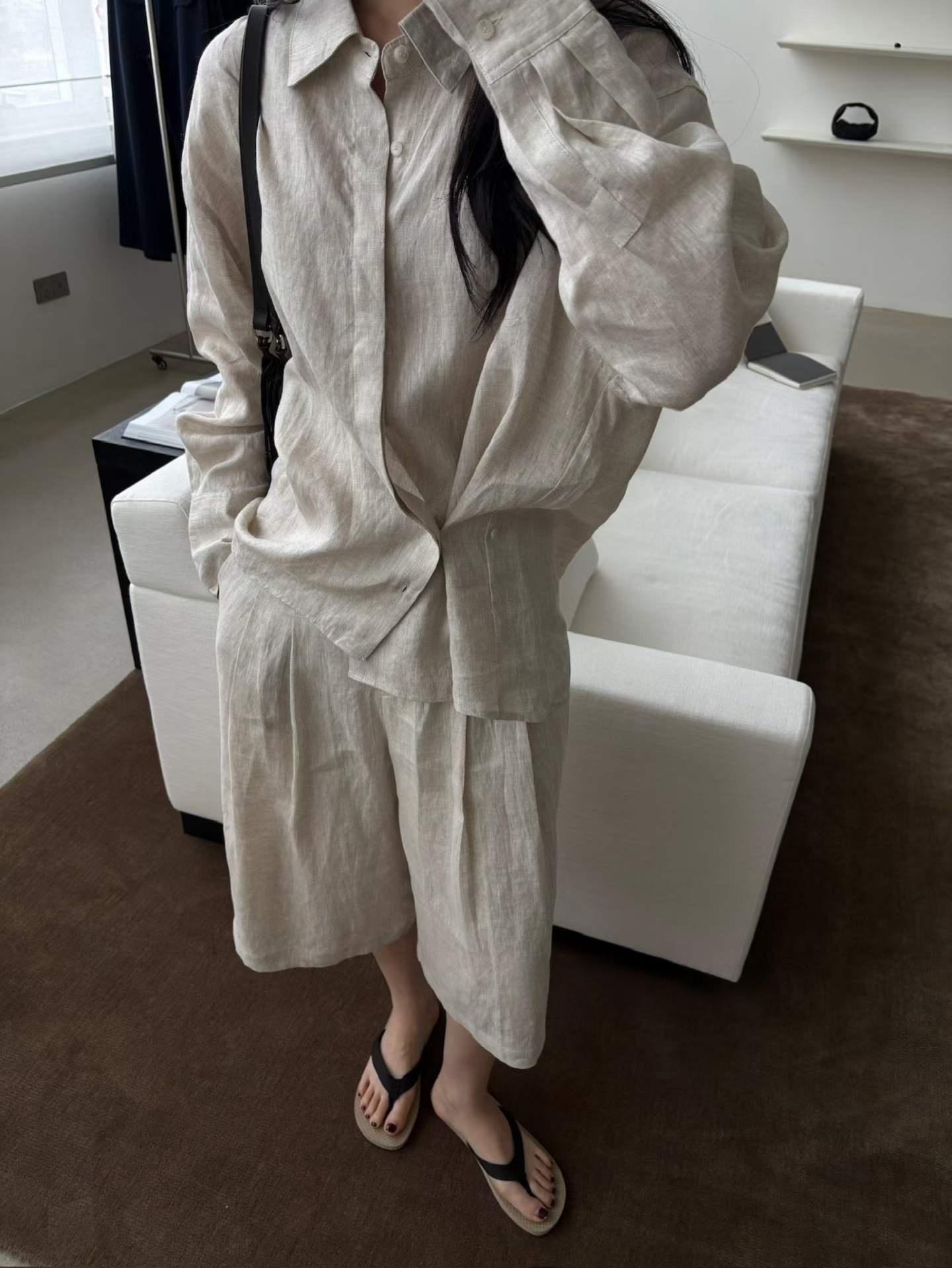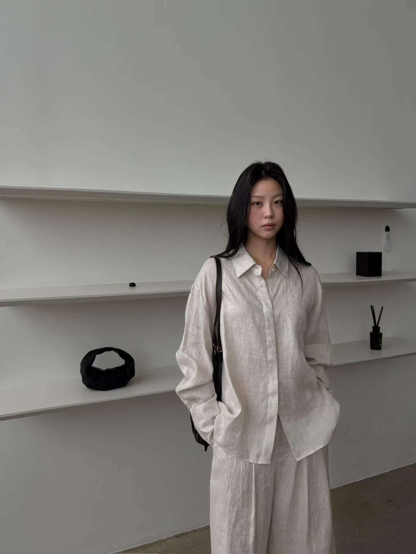 リネン100%ならではの、軽やかで上質な風合い。肌に張りつかず、暑い季節でもさらっと快適に着られる一枚です。