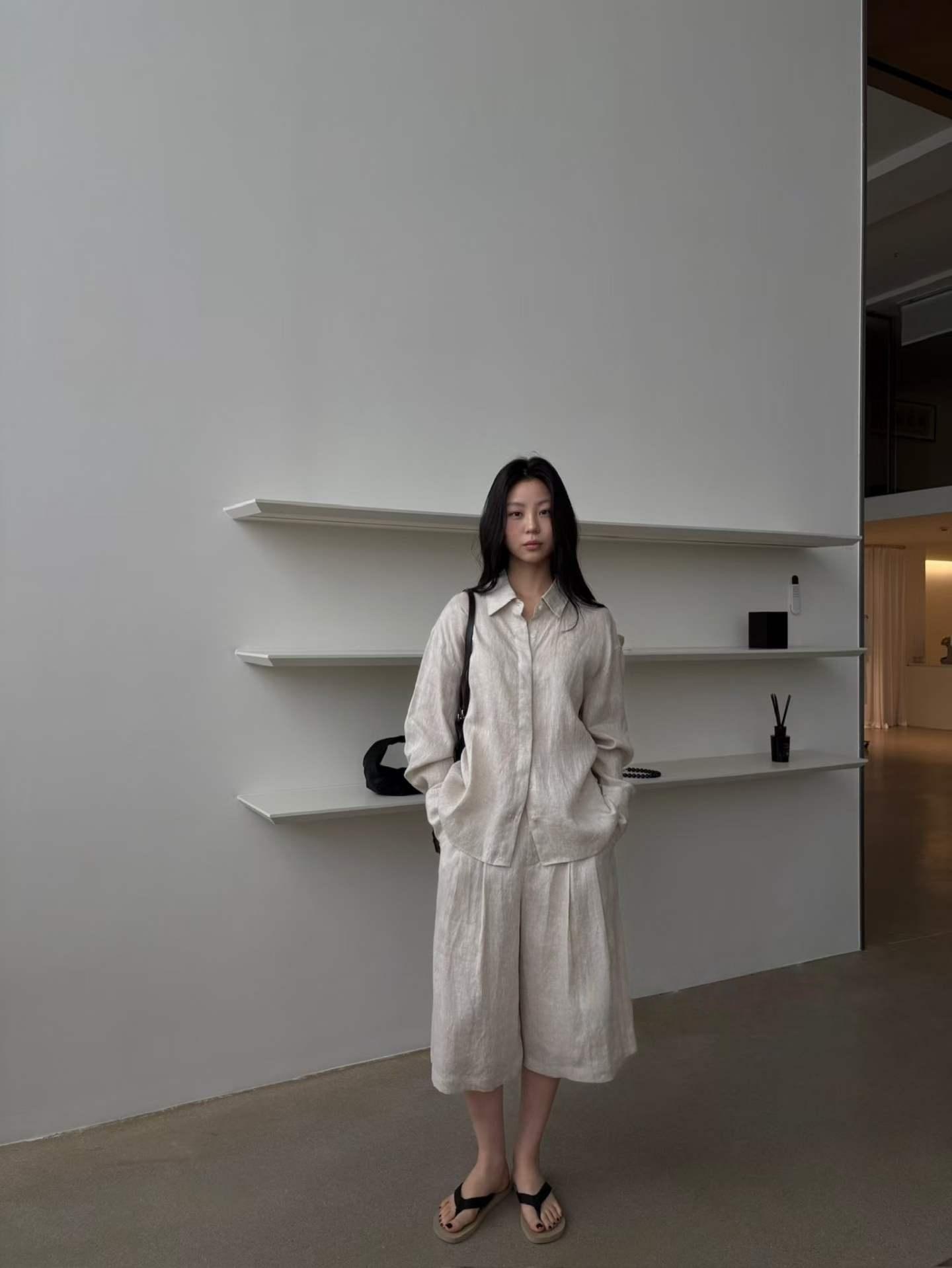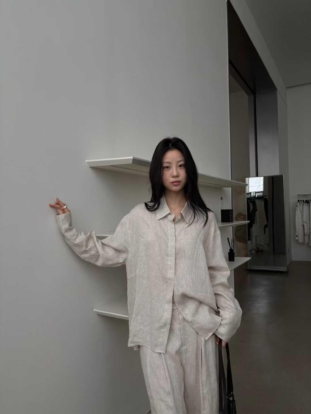 WP0059 PURITY JAPAN リネン100% デザインシャツ レディース 長袖 袖口ゆったり 変形ボタン フレンチミニマル 上品 高見え 涼しい 通気性 体型カバー 羽織り 麻シャツ セットアップ対応