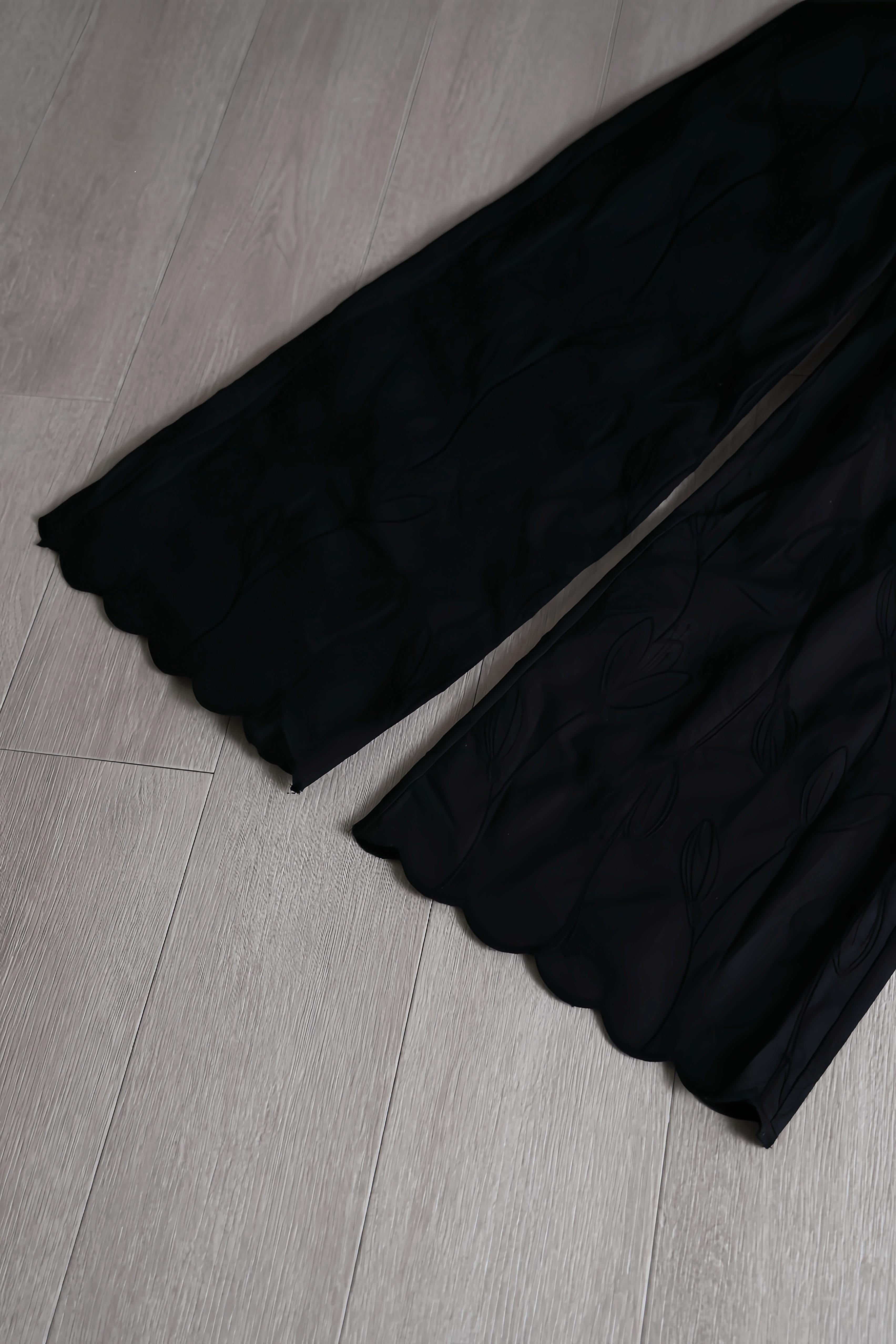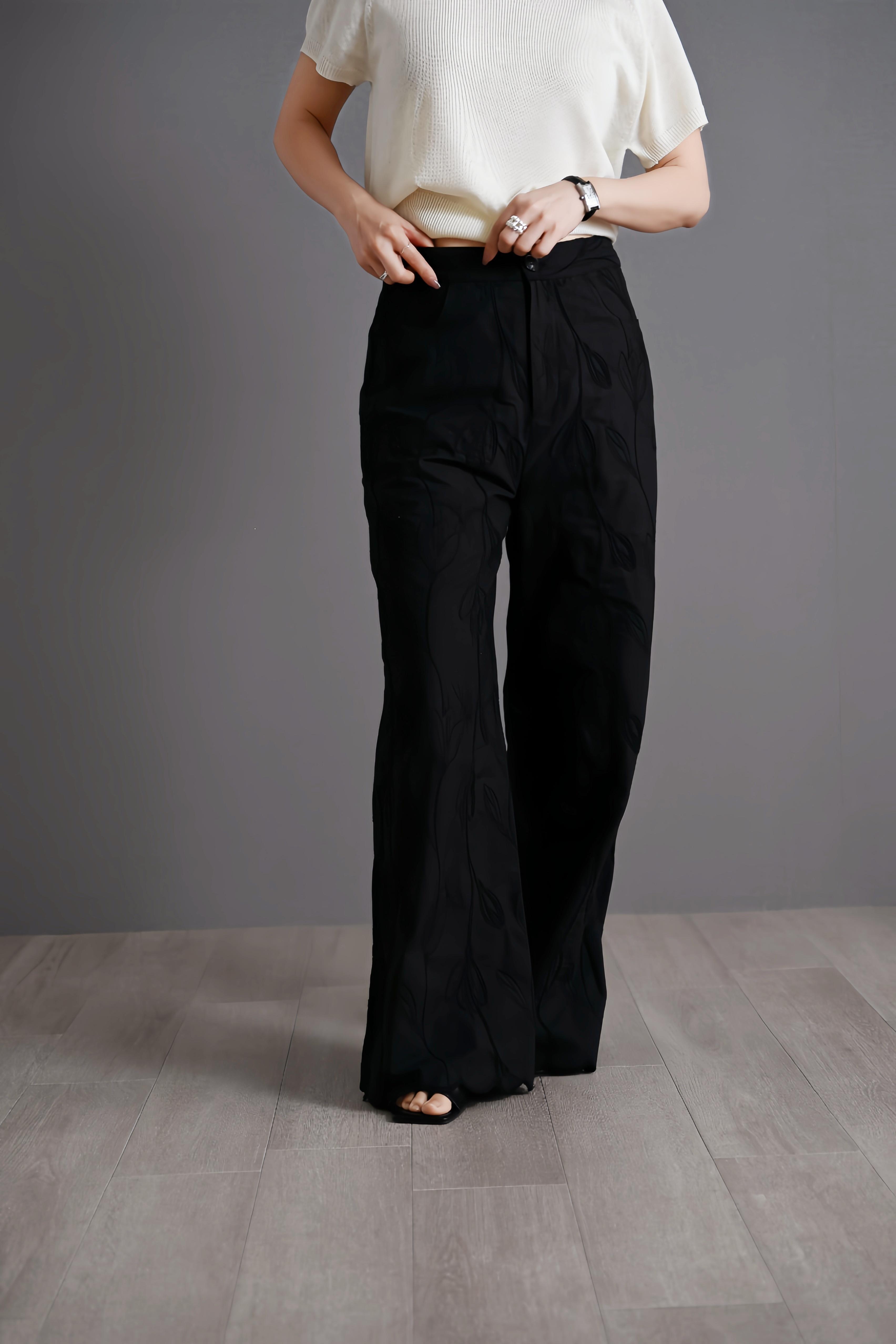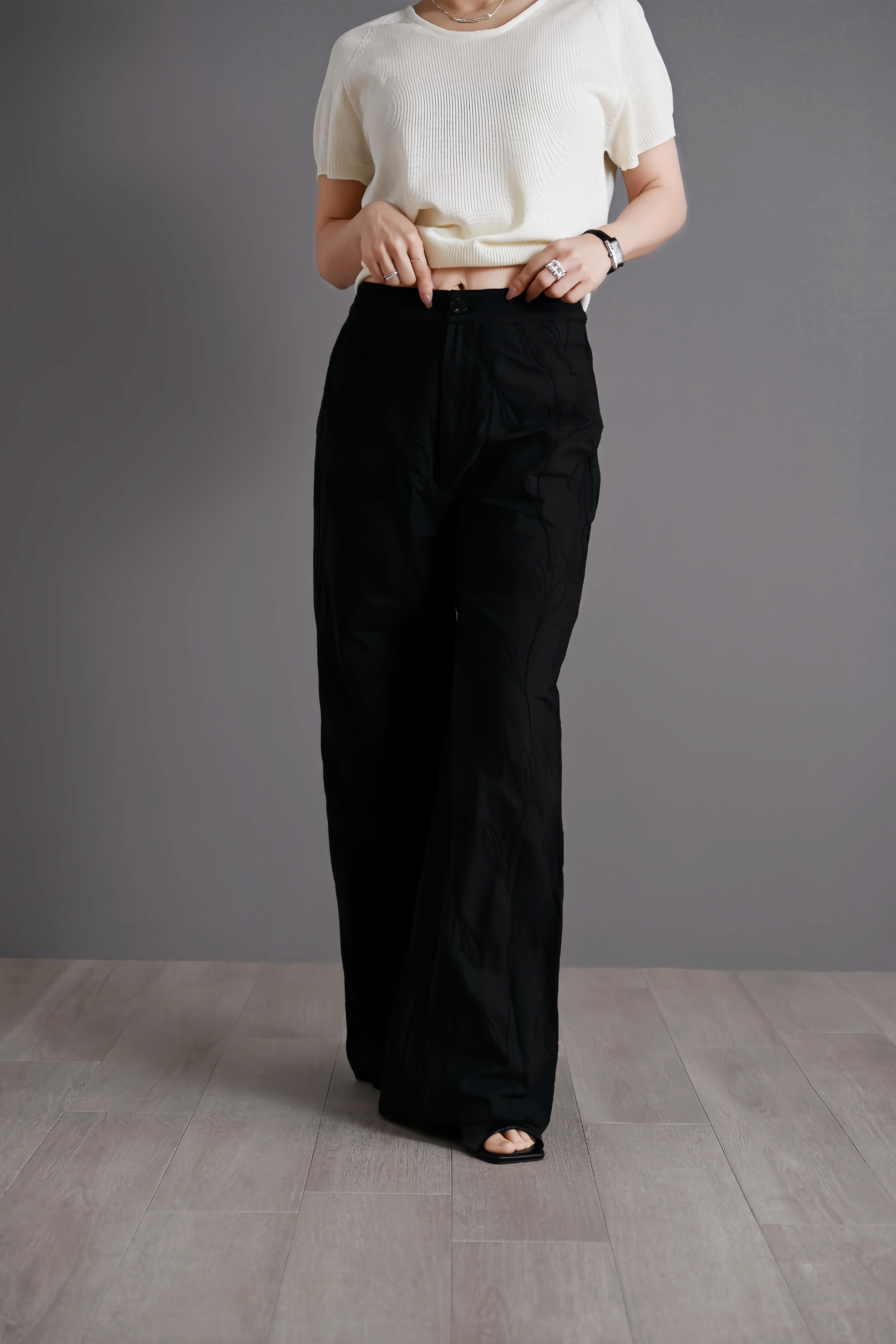 6105028P PURITY JAPAN コットン刺繍ワイドパンツ レディース 黒 ハイウエスト 無地 花柄エンブロイダリー 波裾 体型カバー 美脚 ロングパンツ 春夏
