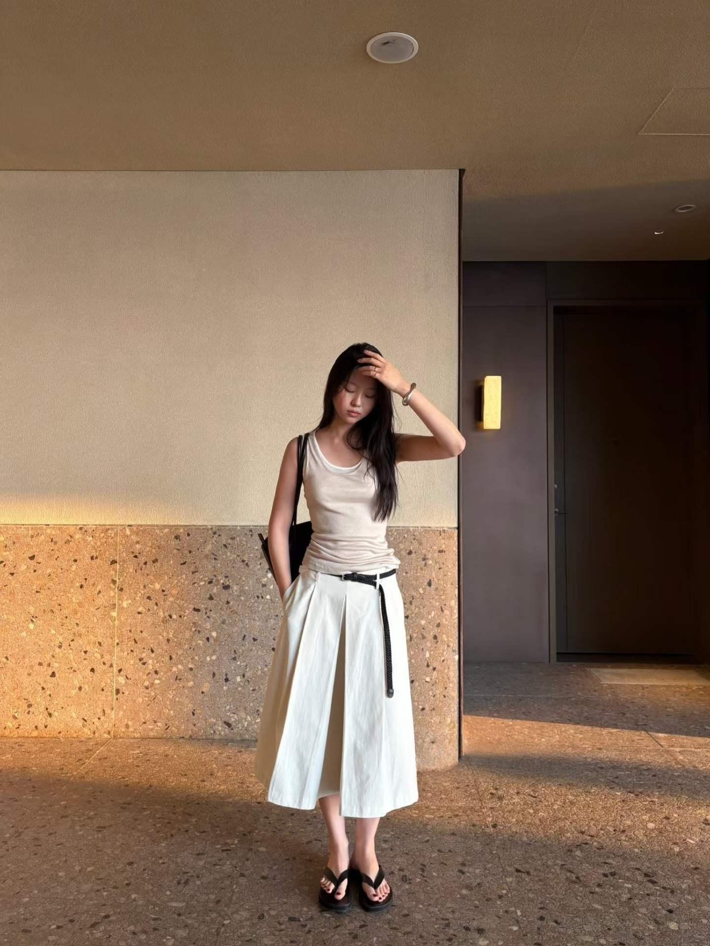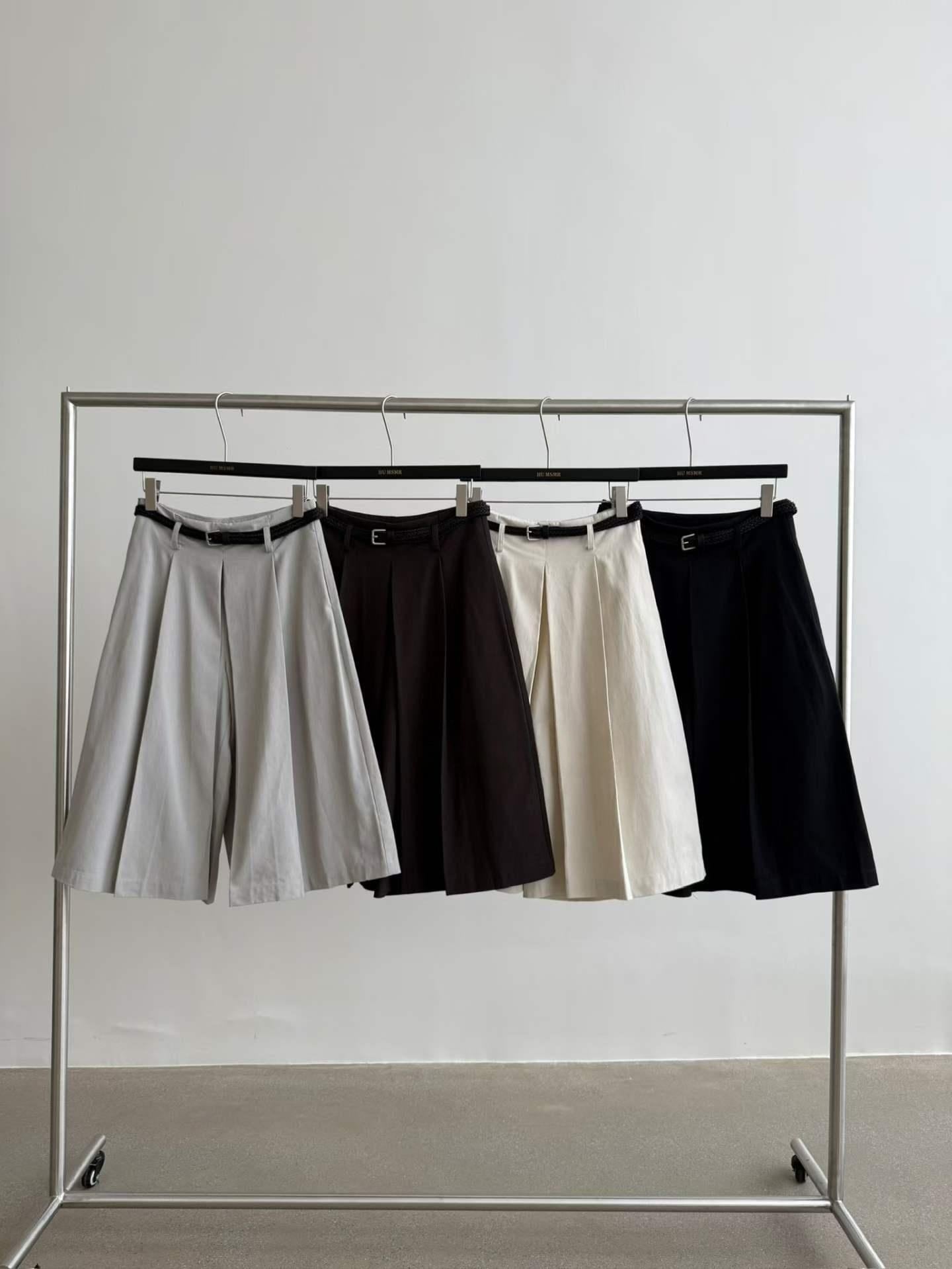 フロントのタックが縦のラインを強調し、気になる腰まわりやヒップラインを自然にカバー。広がりすぎない絶妙なシルエットで、すっきりとした印象に仕上げてくれます。
