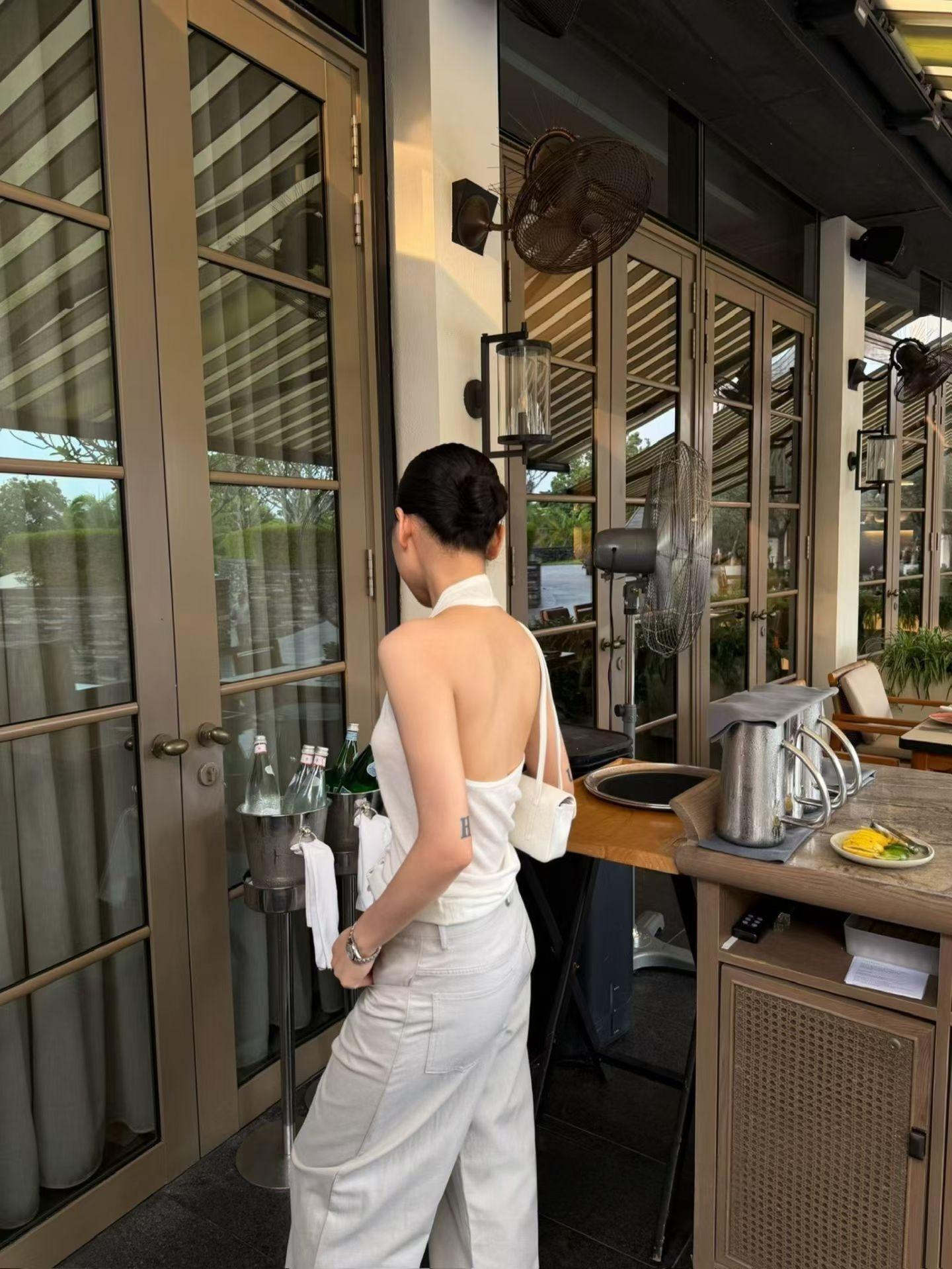 ホルターネックのデザインが肩まわりとデコルテをすっきり見せ、背中のラインもきれいに演出。