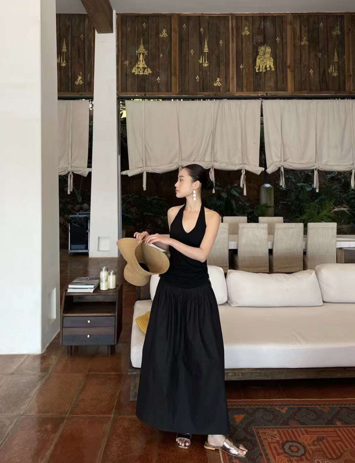 7268 PURITY JAPAN バックオープン黒ワンピース レディース ホルターネック 美背デザイン 上質コットン ロング丈 フレアシルエット 着痩せ 体型カバー 大人上品 フレンチミニマル 高見え 夏ドレス