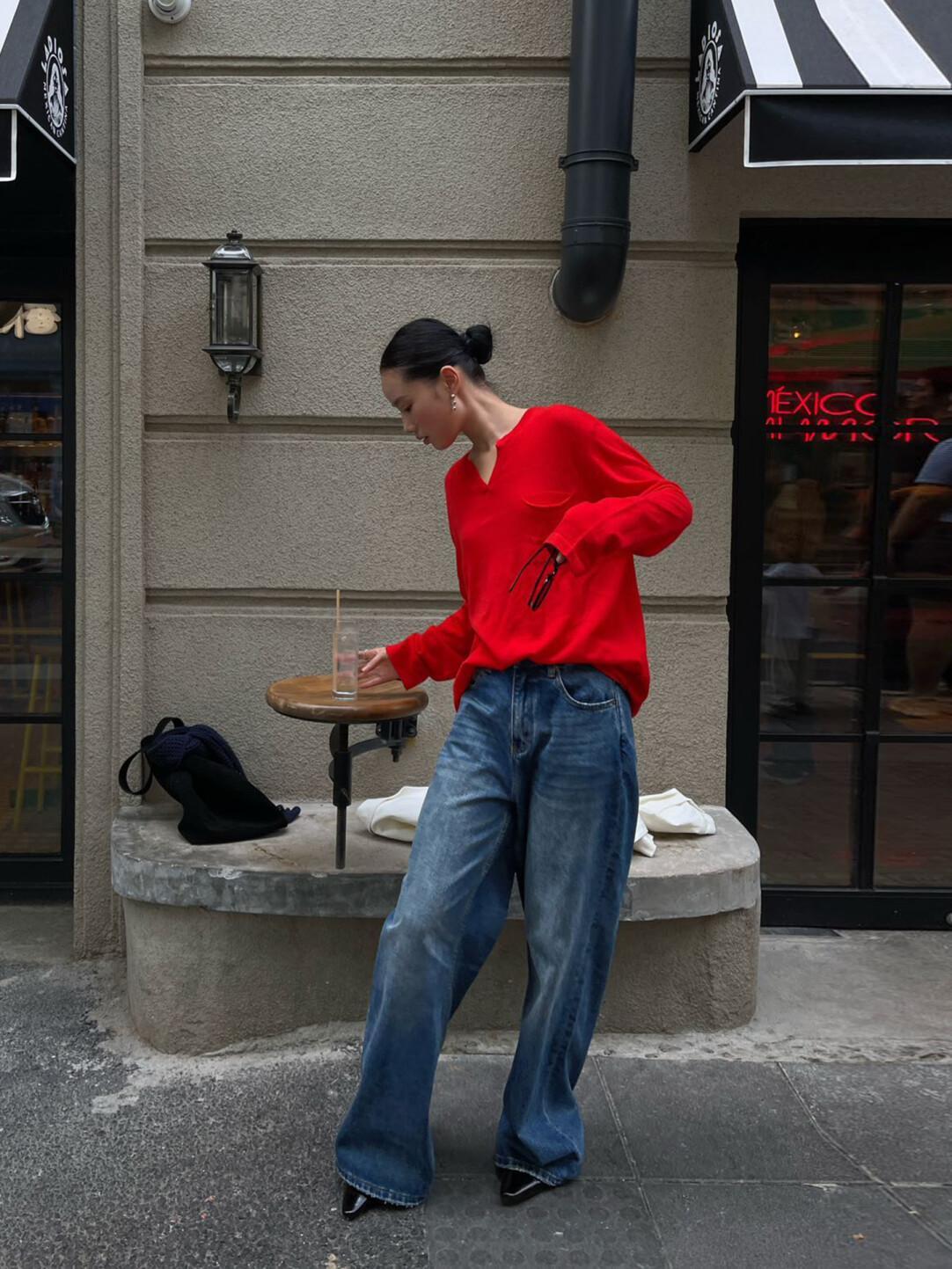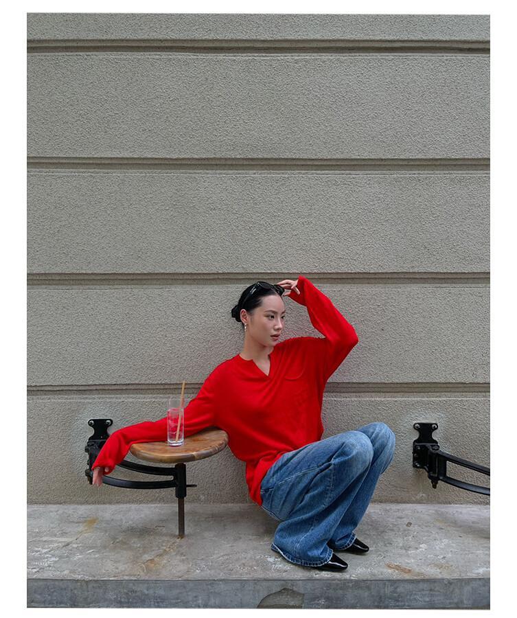 6882 PURITY JAPAN · 韓国風ミニマル ニットトップス レディース 新作 長袖 ゆったり スリム見え シャツ風 大人可愛い 体型カバー 通勤 カジュアル レッド(チャイナレッド)6882