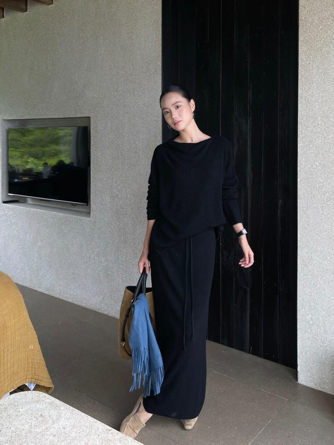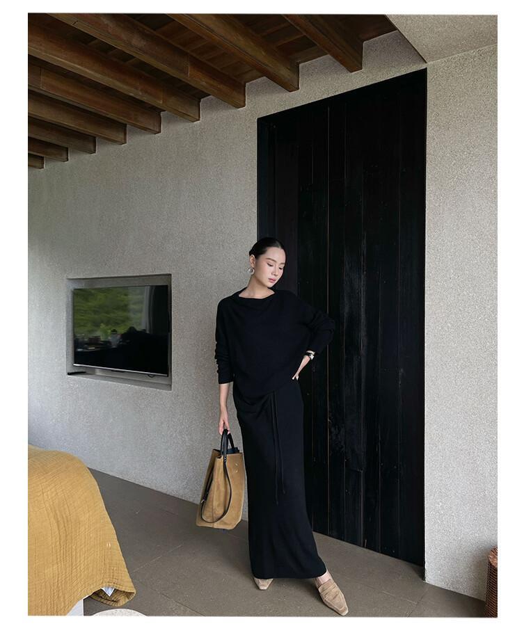 6950 PURITY JAPAN · フレンチミニマル ウールニットセットアップ レディース 新作 ゆったりトップス&スカート 上品 シンプル スリム見え 体型カバー 通勤 カジュアル 大人可愛い トレンド コーデしやすい ブラック