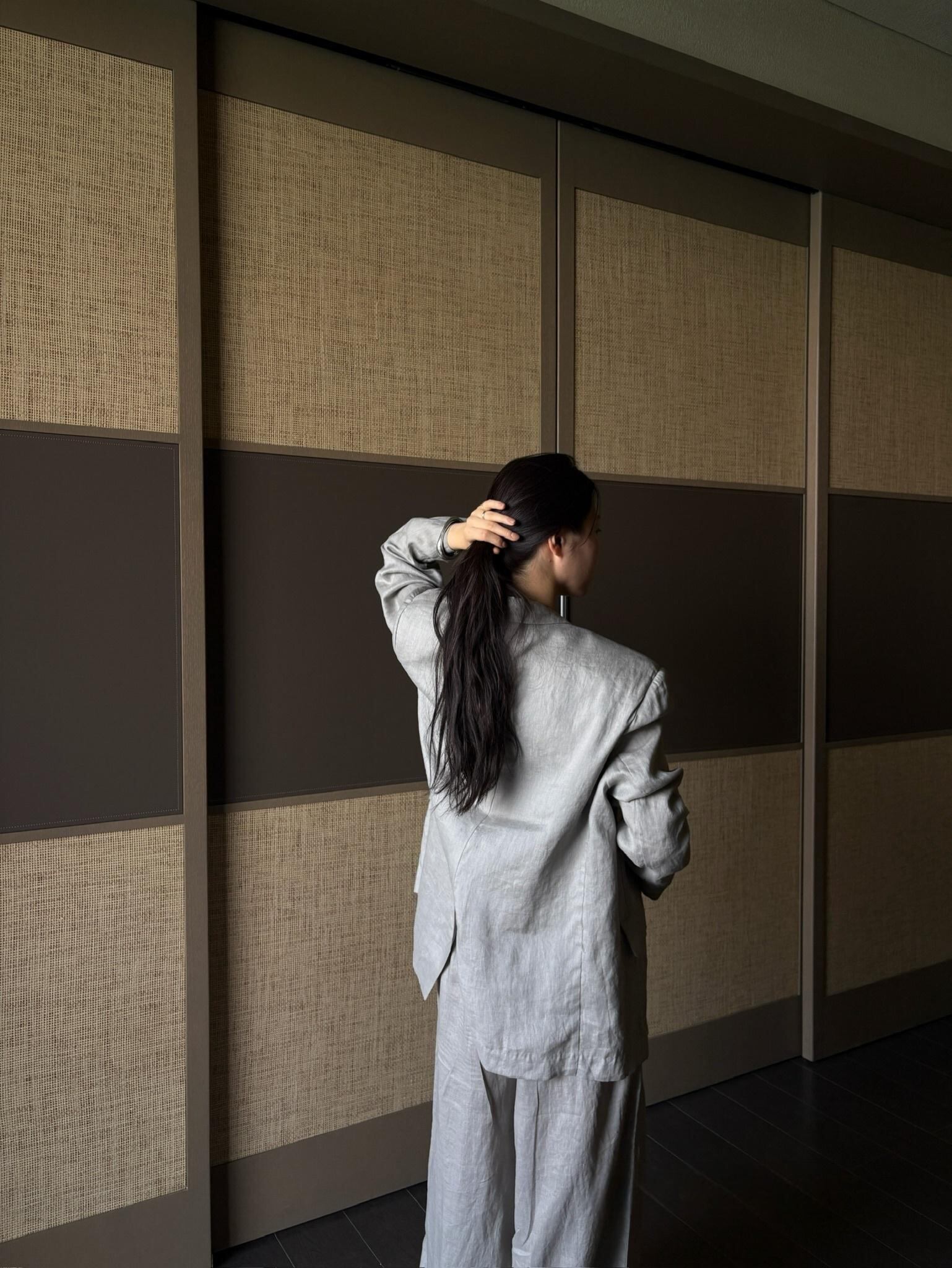 肩のラインは自然に落ち、身体のラインを拾わないシルエットで、羽織るだけで“抜け感のある上品さ”を演出します。
